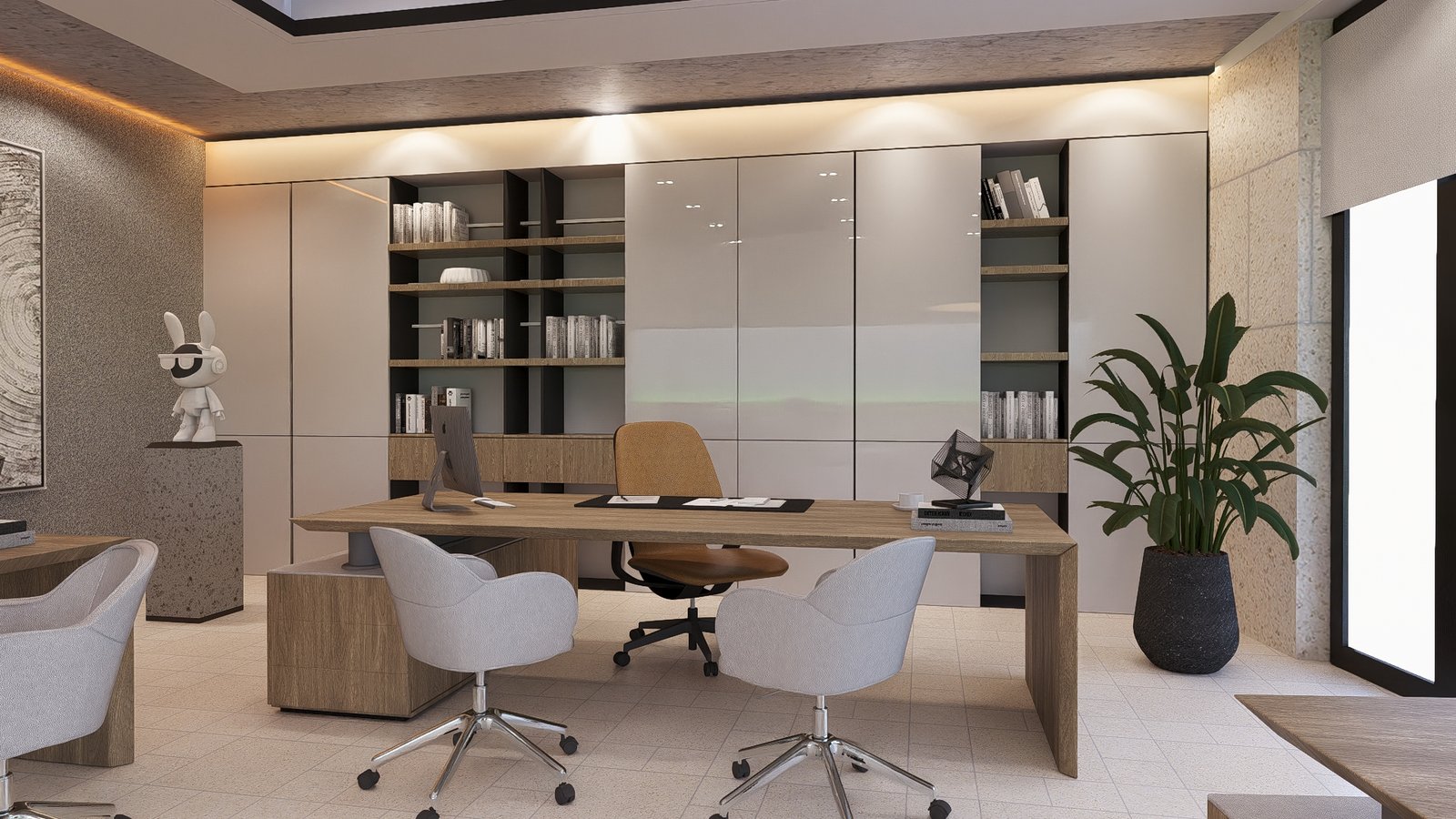 A modern workspace crafted for creativity, focus, and collaboration. The open layout blends natural materials, warm lighting, and greenery to create a calm yet inspiring environment. Every element — from custom furniture to subtle textures — is designed for balance and sophistication. It’s where functionality meets aesthetic harmony, turning everyday work into an elevated experience.